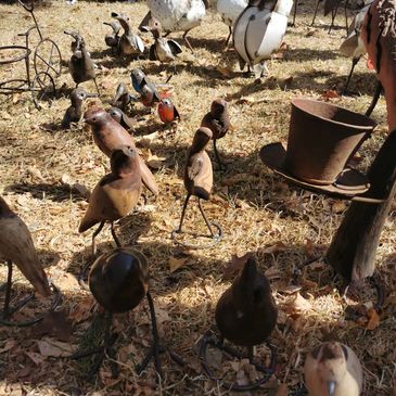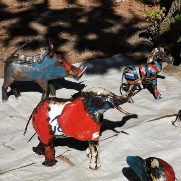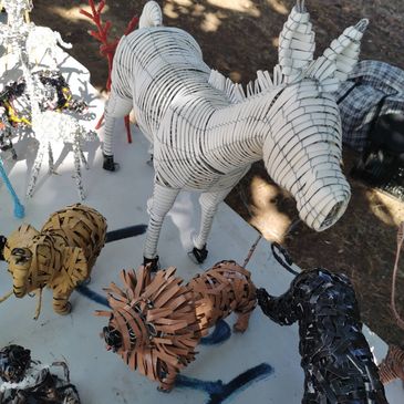 Metal sculptures. Stone and wood carvings. Ceramic animals.