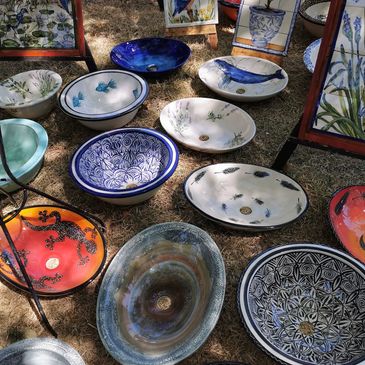 Pottery Washbasins suitable for bathrooms, kitchens, braai areas etc. Handmade tile murals to match our basins, or simply as pieces of art in themselves.